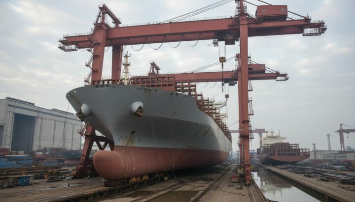 Строительство корпуса крупного танкера класса суэцмакс в сухом доке современного судостроительного завода.